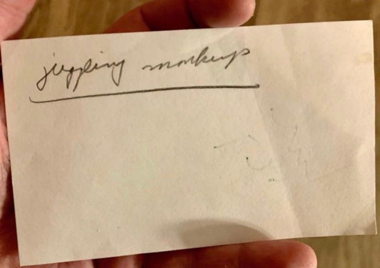 But inside this box (which for purposes vaguely related to avoidance I have not entirely gone through even though more than a decade has passed since his death), there was something even more unsorted than the rest of it: a 3x5 notecard that said, in his inimitable scrawl, two words you never really want to come across: “juggling monkeys.”