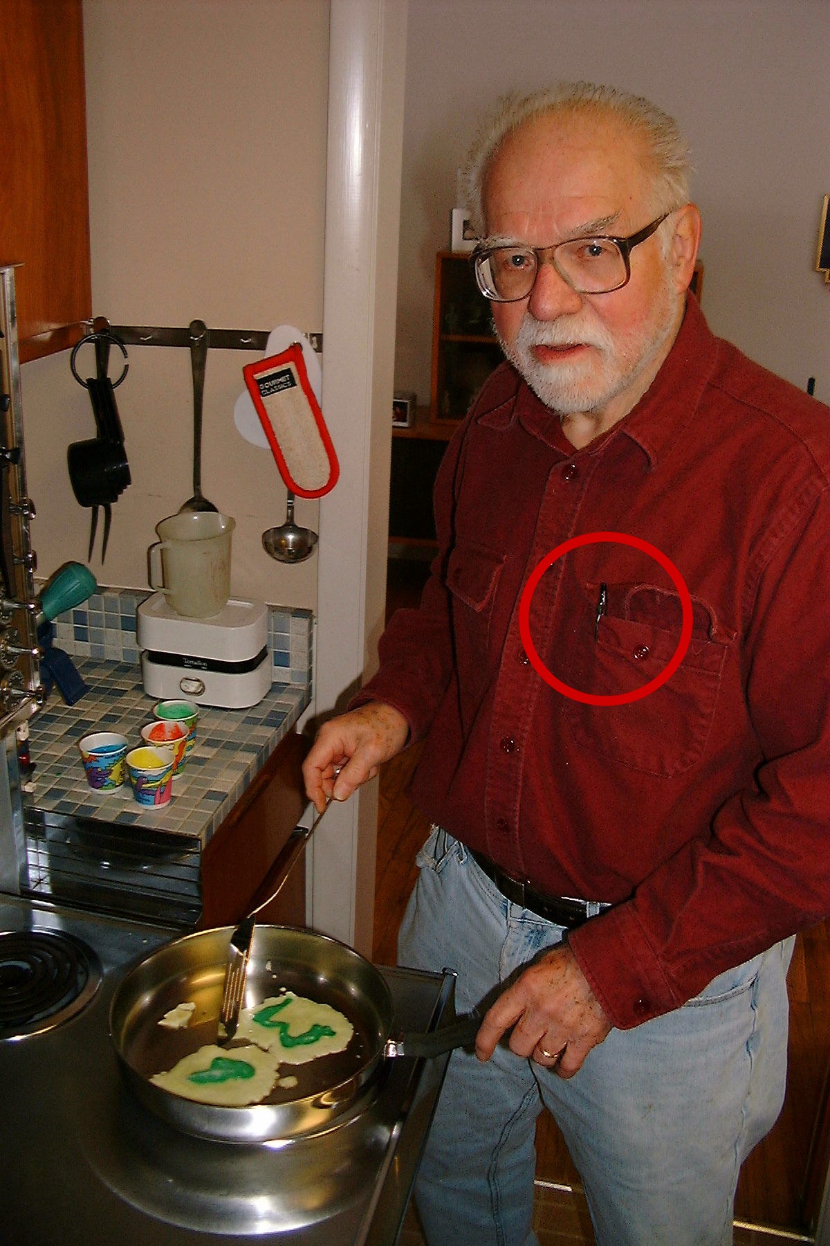 And the pen — well, the pen is a whole lot easier to find. He felt naked if he didn’t have a writing implement with him, a trait that has been visited unto the next generation; of that I and some prematurely inked shirts can attest.