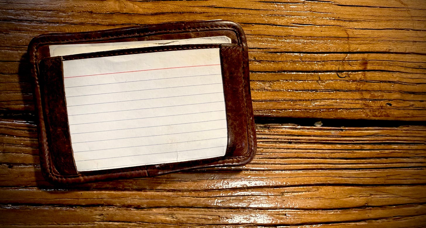 My father was never without notecards — what he called “3x5 cards” — and a pen stuffed in his collar. This morning, I pulled out one of the more than a dozen leather and leatherette notecard folders he left behind (above) and slid out the contents — brain droppings if there ever were such a thing.