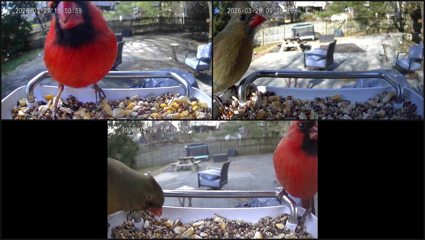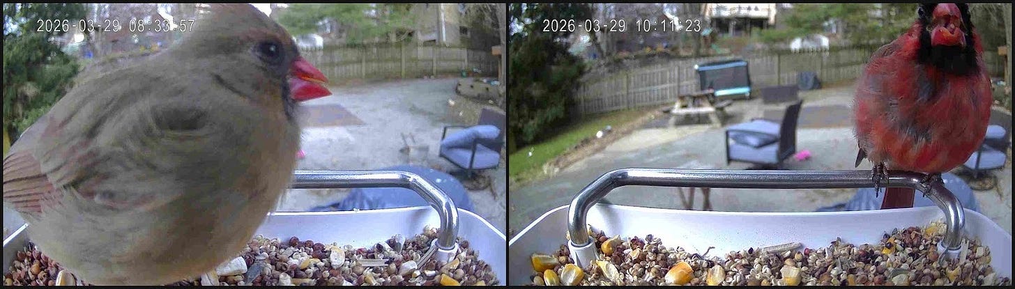During yesterday’s review, we spotted some cardinals who looked a little strange — ratty feathers, short tails, undersized. Not as majestic as Lulu or especially Jim (as male birds are typically quite vibrant to attract mates). We'd been reading about nesting the night before, how the dad feeds the mom while she incubates, how the eggs hatch. We looked at these funny-looking birds and we feorized (my daughter's working on her th sounds) that the fake spring warmth might have actually tricked Lulu and Jim into nesting early, that these were their babies, coming to the feeder hungry and rough around the edges. Maybe that’s why Lulu and Jim are so hungry.