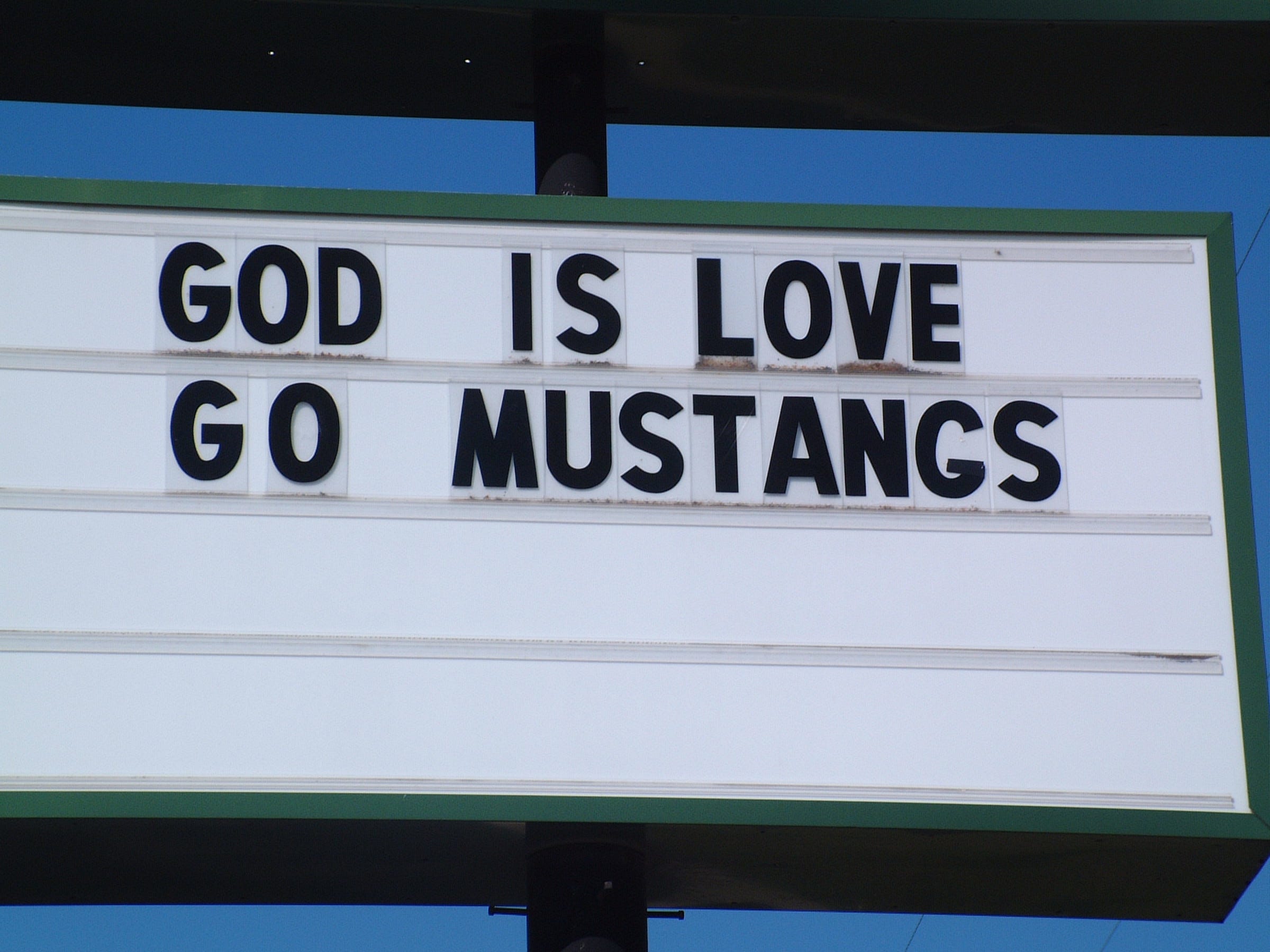 What appealed to me so much about this sign? At the time, I thought it was just plain weird and fun. But it contains something more meaningful, in kind of a classic rhetorical sense: the contrast between the vast, sprawling, existential statement that “God is love” and the very real, visceral, Friday-night-lights summoning of scholastic sports that says “Go Mustangs.” The elegantly eternal and the aggressively municipal, right there next to each other.