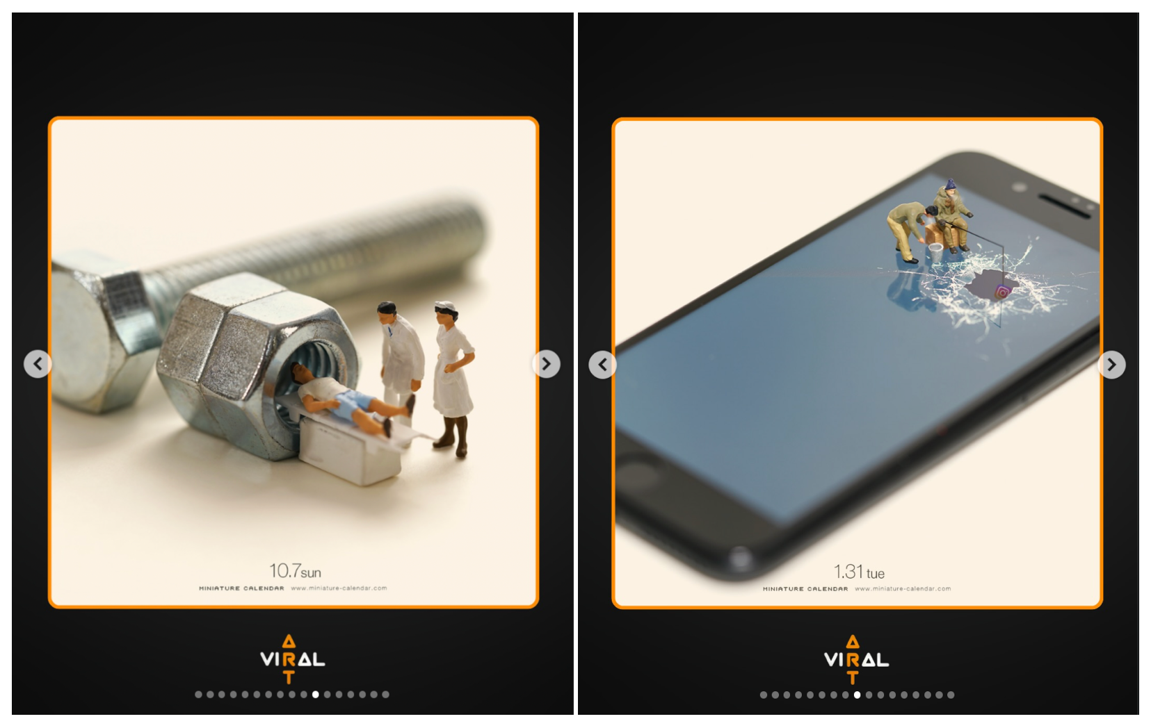 This series of images by Tatsuya Tanaka, from viral_art on Instagram, are some of the best of this kind of genre. Using workaday materials like rice, Pringles, chewing gum, nuts and bolts and a spiral notebook with the spirals removed, Tanaka reframes everyday objects and makes subtle connections between certain physical parts of our world and others.