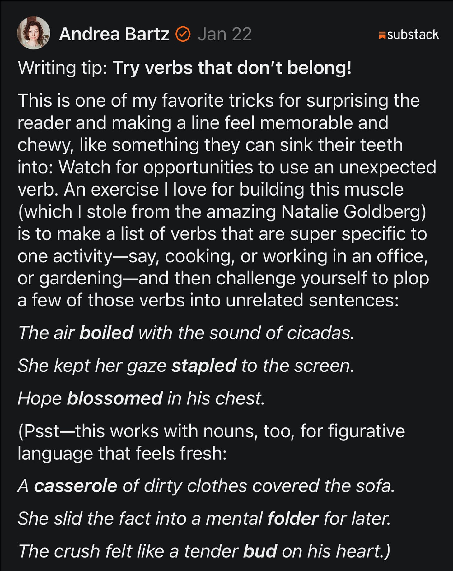 I ABSOLUTELY ADORE this storytelling tip from Andrea Bartz. As someone who falls in love with favorite words and phrases (I used to get made fun of on my college newspaper for overusing “beleaguered,” and I’m terrified to search for my name and the phrase “jumbled days”), the notion of mindfully being counterintuitive about your lexicon is a fun one.