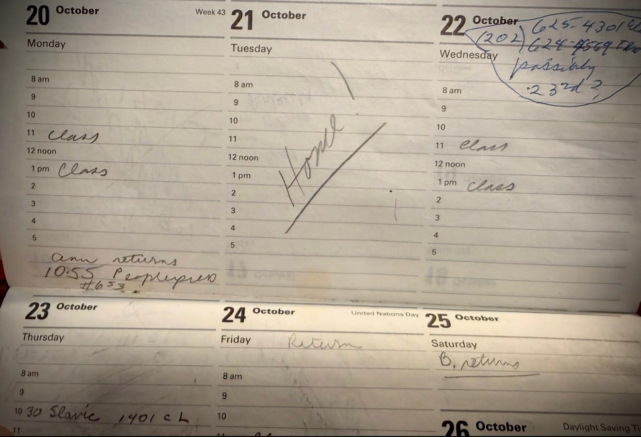 Some entries are cryptic, their meaning lost. Saturday, Aug. 10, 1985: “Flyers on $50 reward distributed.”